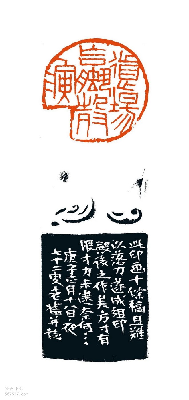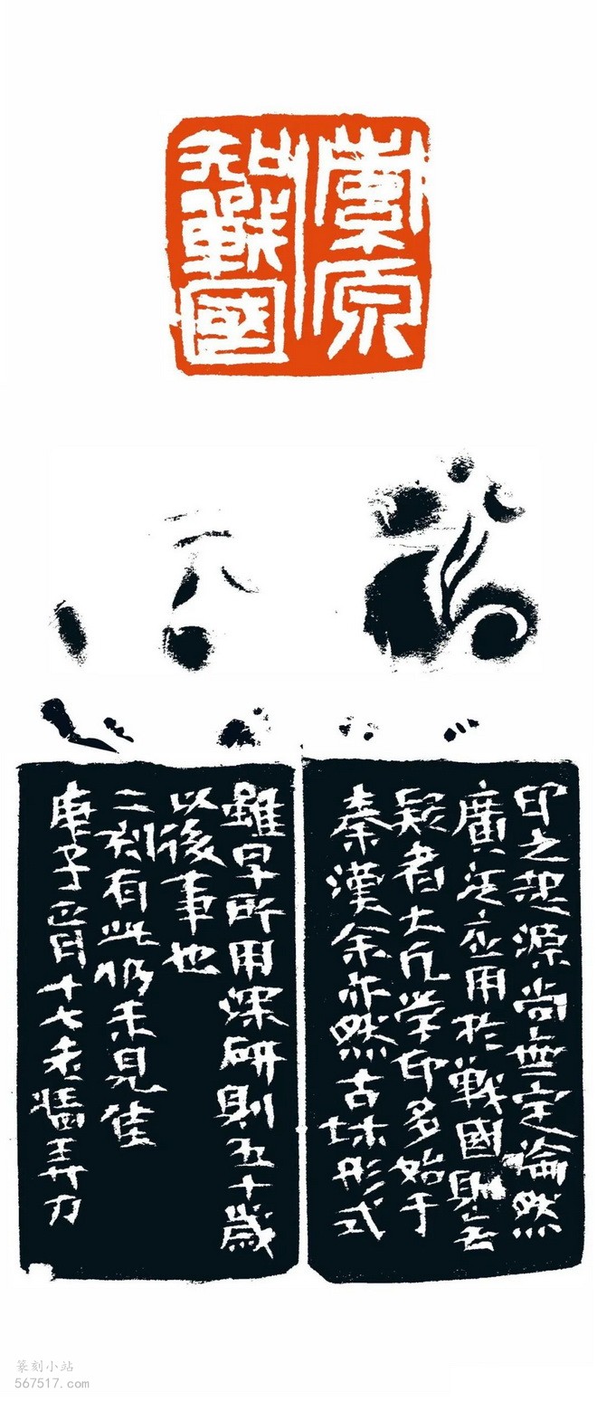 边款:印之起源尚无定论,然广泛应用于战国则无疑者。大凡学习,多始于秦汉,余亦然。古玺形式虽早(有)所用,深研则五十岁后事也。二刻有此,仍未见佳。庚子正月十七,老墙弄刀。