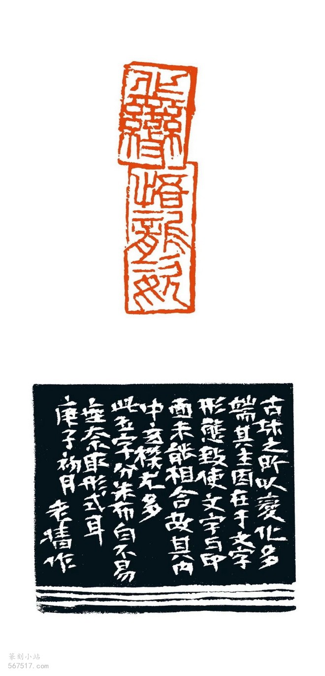 边款:古玺之所以变化多端,其主因在于文字形态,致使文字与印面未能相合,故其内中玄机尤多。此五字分朱布白不易,无奈取形式耳。庚子初月,老墙作。