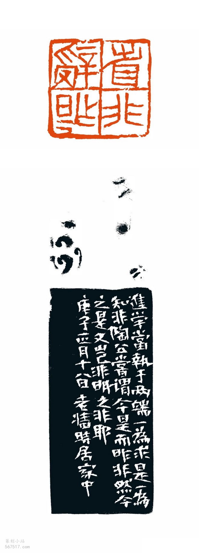 边款:进学当执于两端:一为求是,一为知非。陶公尝谓今是而昨非,然今之是又岂非明之非耶?庚子正月十八,老墙时居家中。
