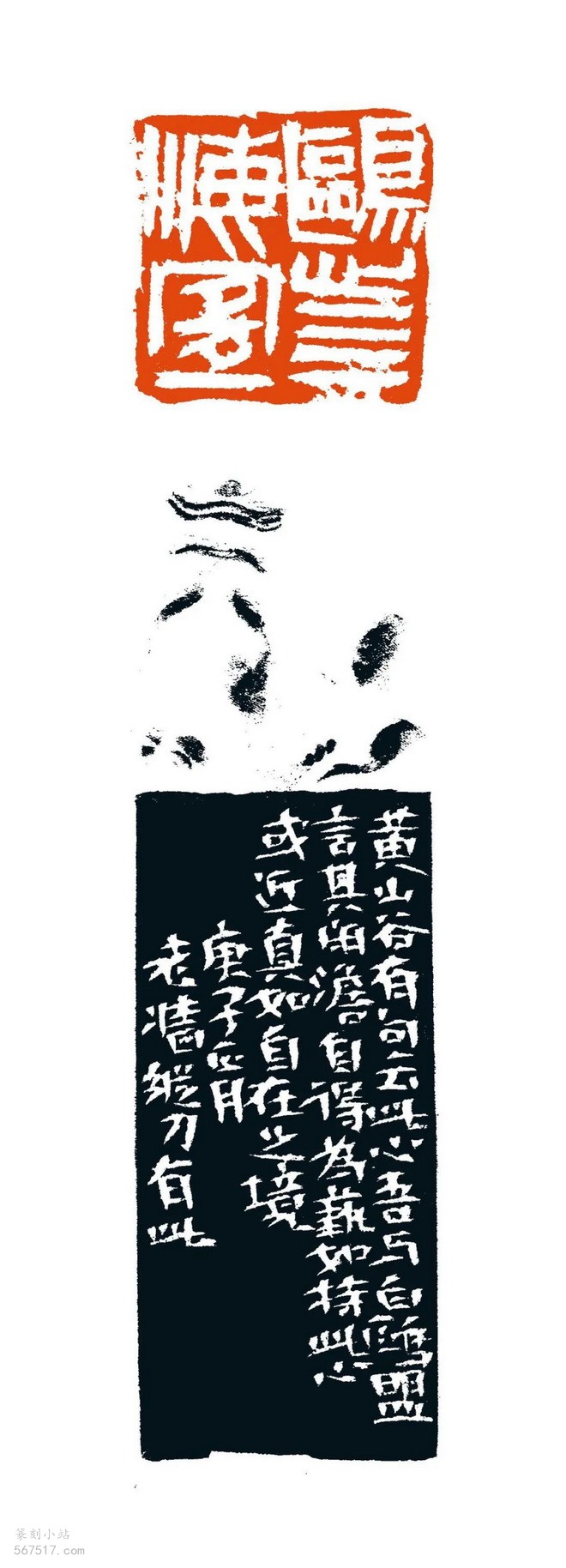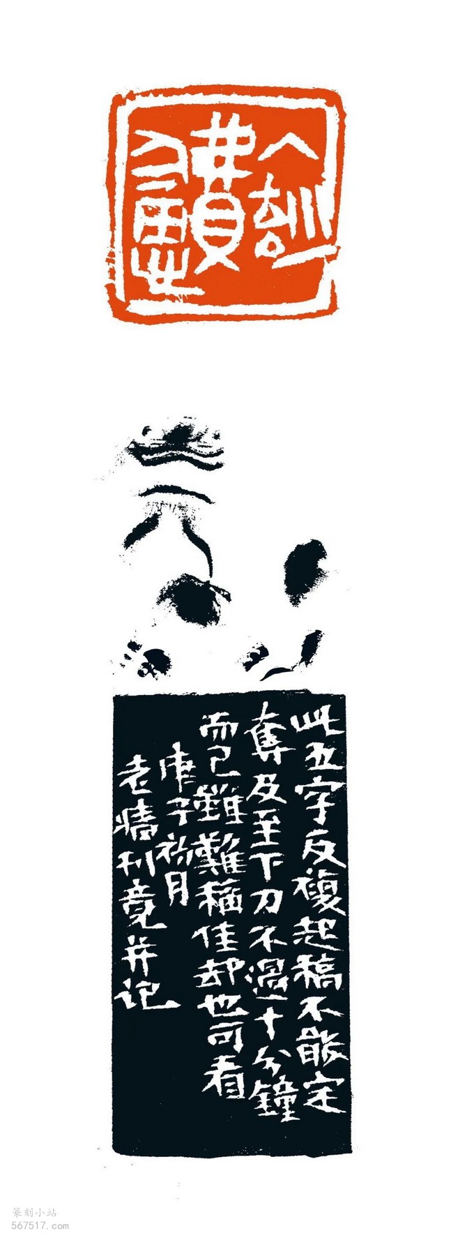 边款:此五字反复起稿,不能定夺。及至下刀,不过十分钟而已。虽难称佳,却也可看。庚子初月,老墙刊竟并记。