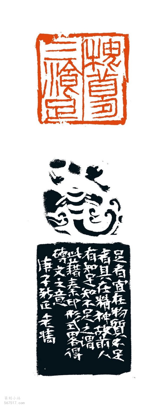 边款:足者宜在物质,不足者其在精神,故前人有“知足知不足”之谓。此藉秦印形式,略得砖文之意。庚子新正,老墙。