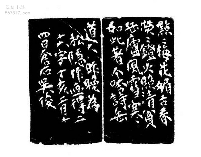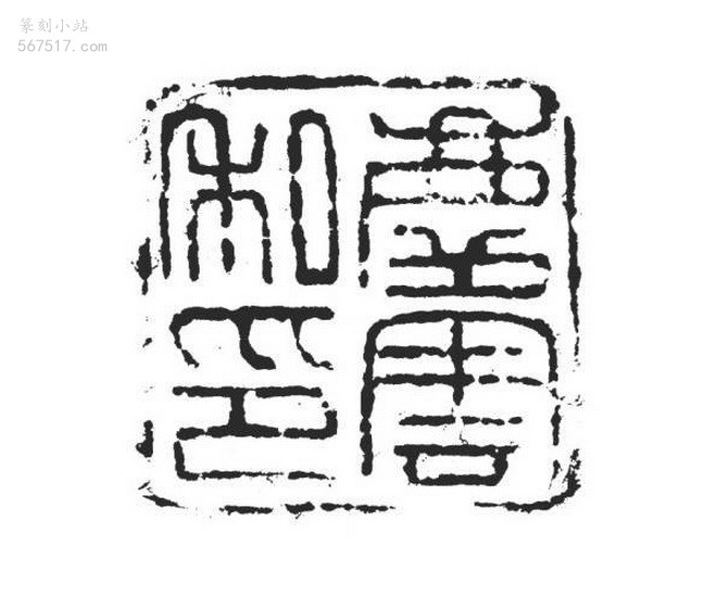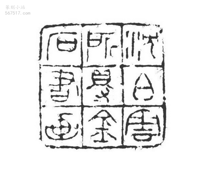 图三“石门沈云”青田,六面方。体高3.9厘米弱,面纵宽均2.2厘米。朱文。款署内左二侧,真书各四行:“点点梅花媚古村,莹莹灯火照青贫。缶庐风雪寒如此,著个吟诗缶道人。昨晚为松隐作画,得二十八字。丁亥二月十四日,昌石吴俊。”是印刻于1887年,时吴昌硕44岁。将《石鼓文》篆书的结体融入印文当中,形成上紧下松、左低右高的结构特征,是吴昌硕特有的一种篆刻风格,在这方印章中,这种风格已露端倪。