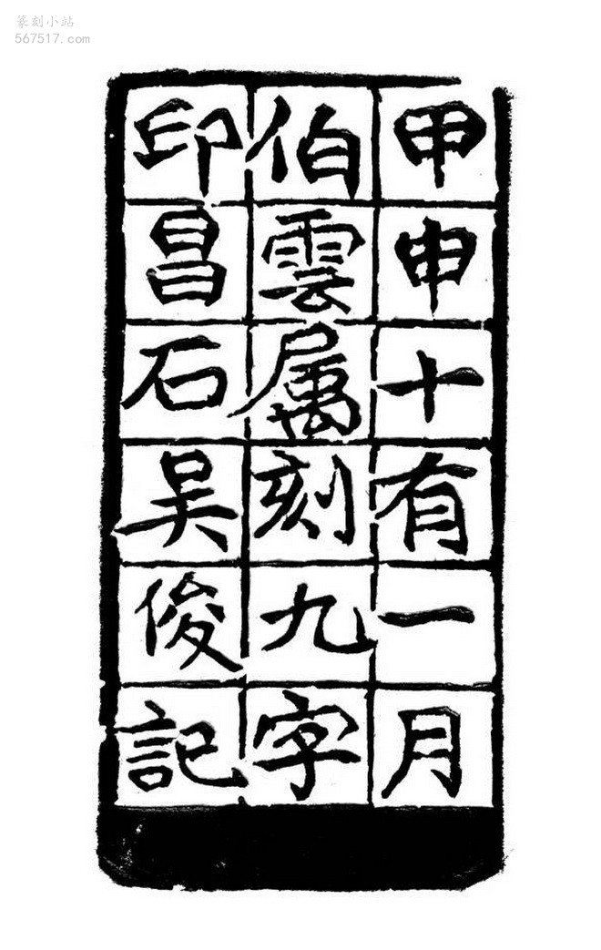 图一“沈伯云所得金石书画”,为一枚普通青田石印,六面方。体高5厘米,面纵宽均2.5厘米。款署左侧,真书阳文三行,有界栏:“甲申十有一月,伯云属刻九字印。昌石吴俊记。”是印刻于1884年,时吴昌硕41岁。此印取法古玺,布局为朱文,界井形栏。尤其是界栏阳文边款,直接取法《始平公造像》,古茂质朴间不乏灵动。