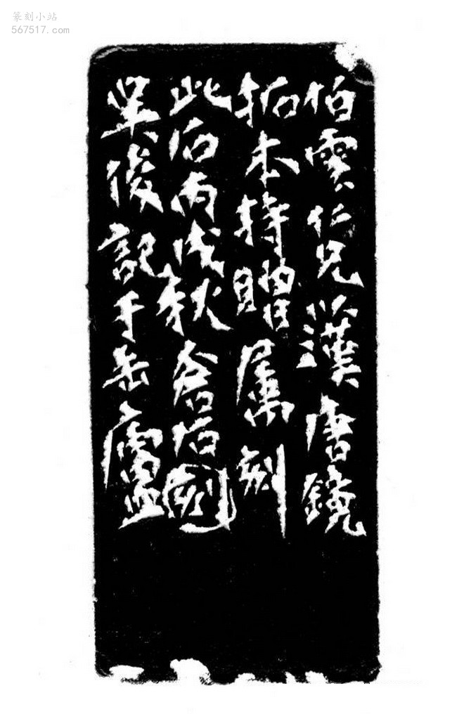 图二“庆云私印”为青田石印,六面方。体高4.8厘米,面纵宽均2.2厘米。朱文。款署左侧,真书四行:“伯云仁兄,以汉唐镜拓本持赠,属刻此石。丙戌秋,仓石吴俊,记于缶庐。”第三行“刻”字,已圈去。此印刻于1886年,时吴昌硕43岁。是印印面分朱布白规矩,笔意胜于刀味,有汉封泥的古拙气息。
