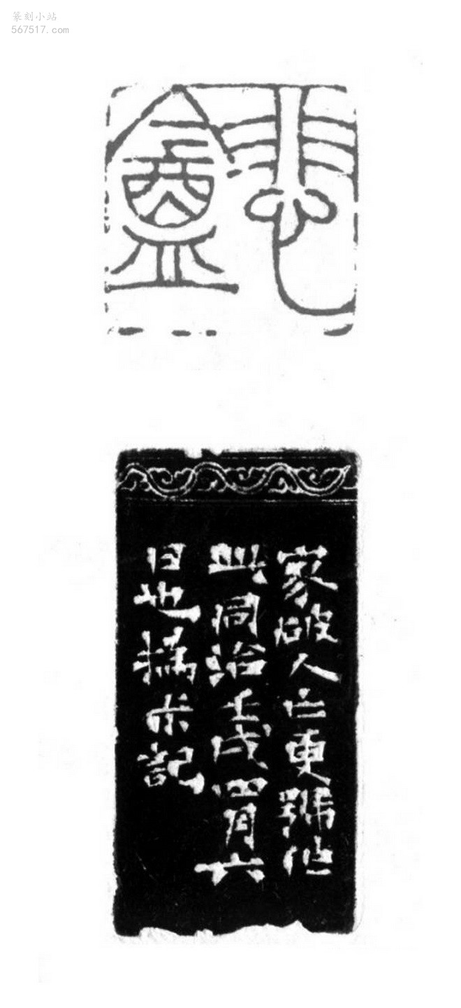 “悲盦”朱文印,青田,六面方。顶端作夔纹,上边四周0.5厘米饰以带状花纹,体高4.3厘米,面纵宽均2.1厘米。款署内侧,真书三行:“家破人亡,更号作此,同治壬戌四月六日也。撝叔记。”