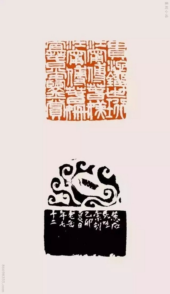 君匋艺术院藏有吴昌硕刻印章共152方,其中有两方“多字印”颇为特别,印面分别为“双忽雷阁内史书记童嬛柳燕掌记印信”、“贵池刘世珩江宁付春媄江宁付春姗宜春堂鉴赏”。这两枚印章,均为6厘米见方的巨印,一直默默躺在钱君匋先生量身定制的印盒内。边款所示,两印皆是吴昌硕为“葱石先生”所刻。那么,“葱石先生”是何方神圣,为何要用如此精美的石章料、刻那么多字?要知道,篆刻家刻印,是按字算润格的,想必吴昌硕概莫例外。