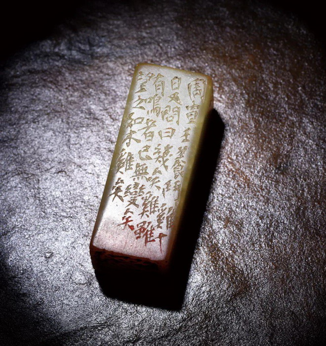 吴昌硕1882年作(Lot 2062 );印文:木鸡;边款:周宣王养斗鸡,十日又问曰几矣,鸡虽有鸣者,已无变矣,望之如木鸡矣,壬午夏日,缶道人吴俊;材质:青田石方章;尺寸:1.6×1.6×4.3 cm;