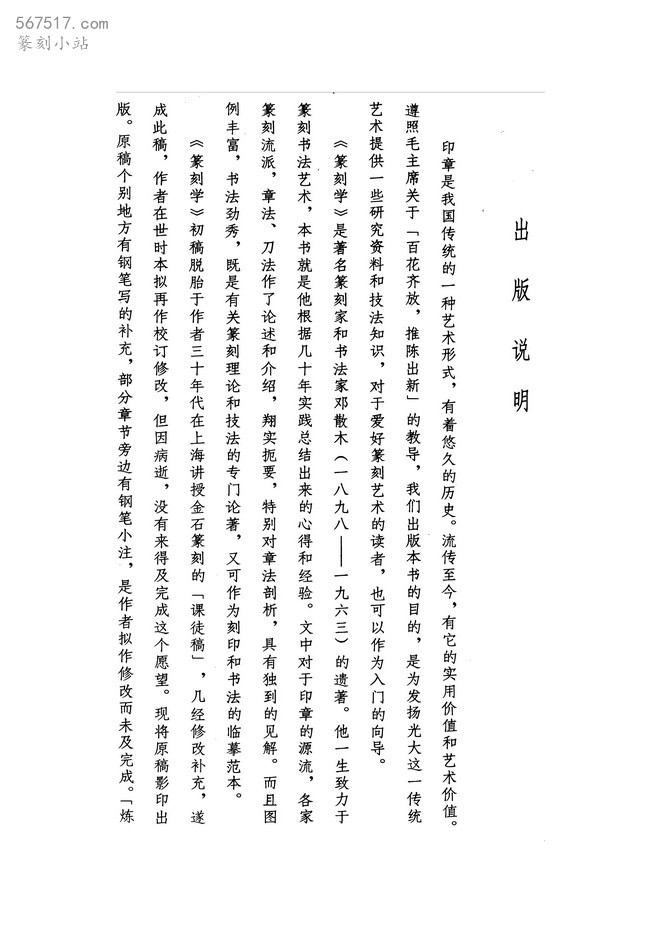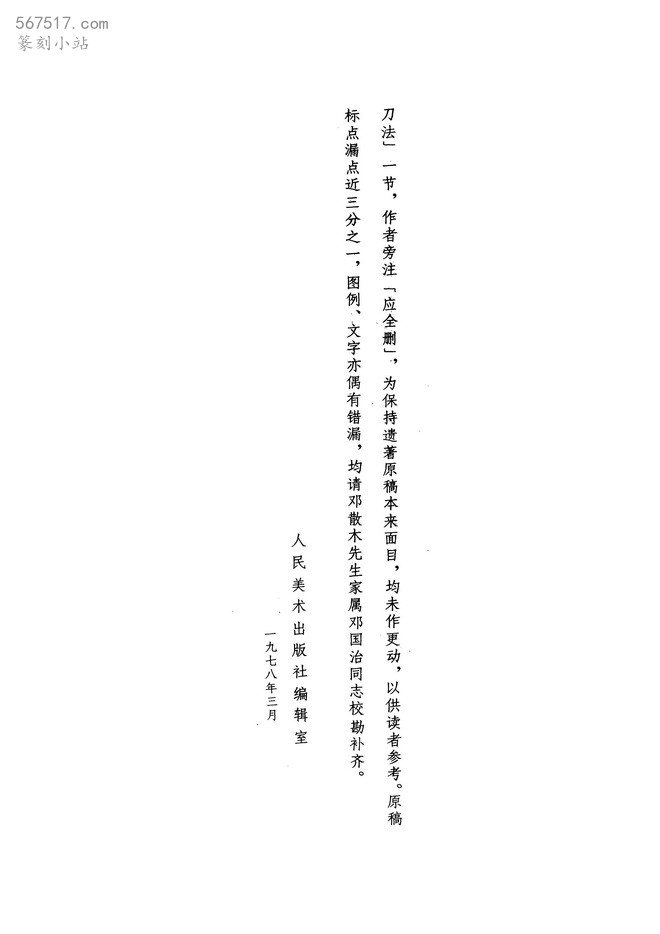 原稿个别地方有钢笔写的补充,部分章节旁边有钢笔小注,是作者拟作修改而未及完成。‘炼刀法’一节,作者旁注‘应全删’,为保持遗著原稿本来面目,均未作更动,以供读者参考。原稿标点漏点近三分之一,图例、文字亦偶有错漏,均请邓散木先生家属邓国治同志校勘补齐。