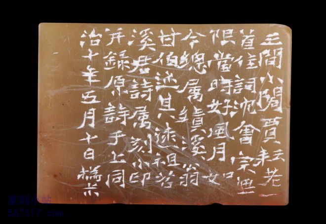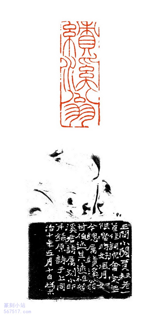 边款:三间小阁贾耘老,一首佳词沈会宗。无限当时好风月,如今总属绩溪翁。甘伯述其远祖苕溪君诗,属刻小印,并录原诗于上,同治十年五月十日,撝叔。
