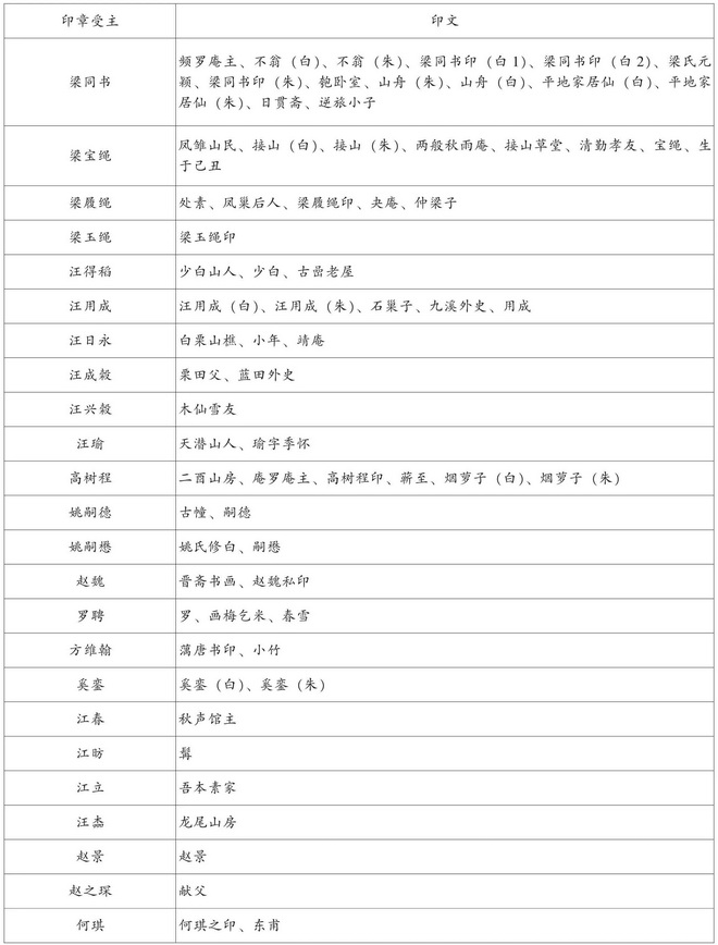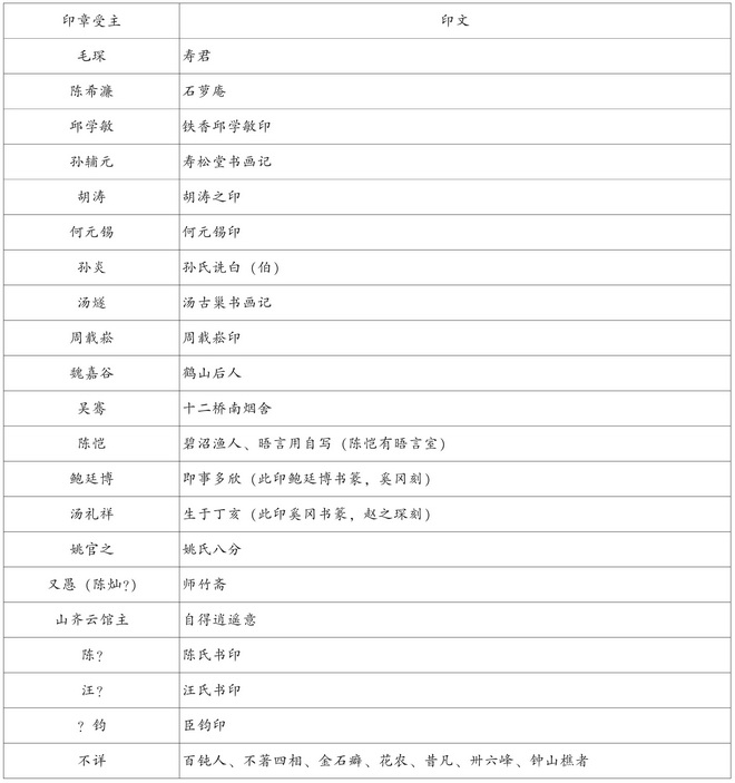 印文毛琛寿君陈希濂石萝庵邱学敏铁香邱学敏印孙辅元寿松堂书画记胡涛胡涛之印何元锡何元锡印孙炎孙氏诜白(伯)汤燧汤古巢书画记周载崧周载崧印魏嘉谷鹤山后人吴骞十二桥南烟舍陈恺碧沼渔人、晤言用自写(陈恺有晤言室)鲍廷博即事多欣(此印鲍廷博书篆,奚冈刻)汤礼祥生于丁亥(此印奚冈书篆,赵之琛刻)姚官之姚氏八分又愚(陈灿?)师竹斋山齐云馆主自得逍遥意陈?陈氏书印汪?汪氏书印?钧臣钧印不详百钝人、不著四相、金石癖、花农、昔凡、卅六峰、钟山樵者印章受主