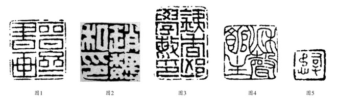 奚冈印章风格比较统一,从印面特征上进行对应,可以分为四类:仿汉白文印、仿魏晋朱文印、仿宋元朱文印、仿先秦朱文小玺。仿汉白文印是奚冈白文印章最主要的类型,代表印作有“陈氏书印”“梁玉绳印”“臣钧印”“赵魏私印”、(图2)“高树程印”“胡涛之印”“梁同书印”(白)、“庵罗庵主”“凤雏山民”“凤巢后人”“石萝庵”“吾本素家”“何元锡印”“周载崧印”“奚銮”(白)、“清勤孝友”等。仿魏晋朱文印有“晋斋书画”“少白山人”“烟萝子”(朱)、“逆旅小子”“孙氏诜白(伯)”“蕅唐书印”“频罗庵主”“梁同书印”(朱)、“嗣德”“日贯斋”“师竹斋”“寿松堂书画记”“铁香邱学敏印”等。(图3)仿宋元朱文印有“髯”“姚氏八分”“龙尾山房”“碧沼渔人”“秋声馆主”、(图4)“奚銮”(朱)、“两般秋雨庵”“平地家居仙”(朱)、“接山草堂”等。仿先秦朱文小玺的作品有“古幢”“嗣懋”、(图5)“昔凡”“处素”“小年”等,一般作阔边朱文的形式,印文则篆法混杂,“古文”与小篆均有。