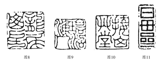奚冈是一位画家,我们似乎可以将其篆刻视为绘画的一种延伸,其印章的线条带有一种抽象的造型意味。陈振濂先生眼光独到地指出奚冈“以俊逸松秀反映出他对绘画形式的心得”,并以“龙尾山房”(图8)印为例,认为此印“具有抽象空间造型意蕴”。[15]这方印章的确是奚冈别具匠心的作品,在线条的空间排布上下足了功夫,刻意改变全印笔画的纵向走势而强调一种“变纵连横”的横向编织。为了达到这种效果不惜将“山”字的构形复杂化,线条如水面波纹一般灵动活泼。相类者如“碧沼渔人”,(图9)也刻意用线条的萦曲来制造夸张的波动效果,惟线条因柔弱无骨而显得过于孱弱。再如“古喦老屋”“接山草堂”,(图10)线条依然十分夸张,带有强烈的装饰意味,制造出与以往篆刻家不同的空间感。这些印作虽然未必个个成功,但依然可以看到奚冈对于印章线条塑造的独出心裁。