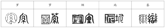 奚冈印章用字崇尚简约,为了使印面文字达到简约化的“古意”效果,甚至不惜将构形比小篆简单的俗篆或古文(大篆)杂糅进来。如“日贯斋”(图11)边款有交代:“《说文》‘毌’读若‘冠’,穿物持之也。‘毌’、‘贯’通,取其古致。”其早年为罗聘所刻“画梅乞米”四字均选用了最为简洁的篆法,“乞米”字形简单,偏安于左隅而与中部长条留红融为一体,恰好等分了整个印面,简约之极而又气韵生动。其他如“罗”“石萝庵”“烟萝子”(朱)、“平地家居仙”(白)、“两般秋雨庵”“奚銮”(朱)等印,文字不少直接取自当时流行的传抄古文字书,特别是《六书通》。(图12)这些古俗字的篆法虽然有的与常规篆法不合甚至讹误的地方,但从印面效果上,确实也取得了一种陌生化的效果。