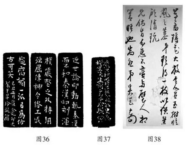 奚冈的行草书非常出色,是日常信札、题画及书法创作的常用书体。(图38)其行草书边款也是最富特色的,早期的行草边款代表作有“十二桥南烟舍”。(图39)从署款“钢”可知约作于二十六岁之前,款文银钩铁画,捺笔锋颖微露,十分儒雅。中后期的行草边款更加随心所欲,可以看出是不经事先书写而信手为之。正因为不需傍依,往往随笔画走势单刀冲刻,偶尔也辅以双刀,用刀的角度呈现出一种无规律的随性状态。又因为是以刀代笔,笔画线条远不及直接书写精准和灵动,却呈现出一种不计工拙的自然畅快之感和率尔操觚的疏离逸致。“铁香邱学敏印”(图40)“凤雏山民”(图41)的边款,都是其中的典型。这种潇洒真率的况味与丁敬的行书款非常相近,我们可将之与丁敬“寂善之印、蕅厓道人”边款(图42)进行类比。