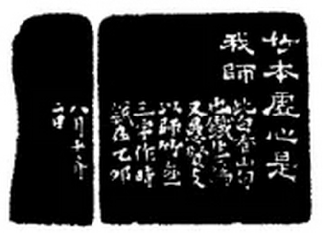 在分析奚冈的边款艺术时,尚需注意其边款的代刀问题。这部分代刀的边款均为楷书,字体秀雅,与奚冈带有行书笔意的楷书款有很大的分别。“姚氏修白”“嗣懋”对印的边款和“接山”(白)(图46)的边款,都非奚冈所作,从秀美的风格上看,应该是陈豫钟所为。[27]陈豫钟曾云:“制印署款……余少乏师承,用书字法意造一二字,久之,腕渐熟。虽多,亦稳妥。索篆者,必兼索之,为能别开一径。铁生词丈尤极称之。”(“希濂之印”款)奚冈非常欣赏陈豫钟的印章边款,又与陈豫钟过往频密,关系介于师友之间,晚年精力、目力衰减,不堪刻小字而由陈豫钟代刀也就不足为奇了。此外奚冈五十岁时所刻“师竹斋”边款(图47),与奚冈款字差别明显,亦系他人代刀。