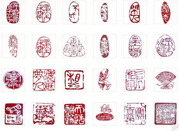 艺术篆刻中,私印篆刻的较多,可分为六类:(1)姓名印,(2)斋馆印,(3)记时记事印,(4)考定鉴藏印,(5)闲文印,(6)肖形图画印。