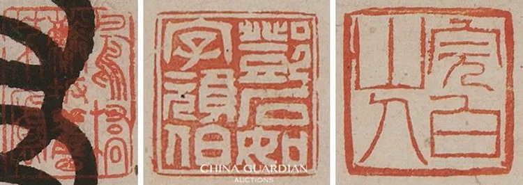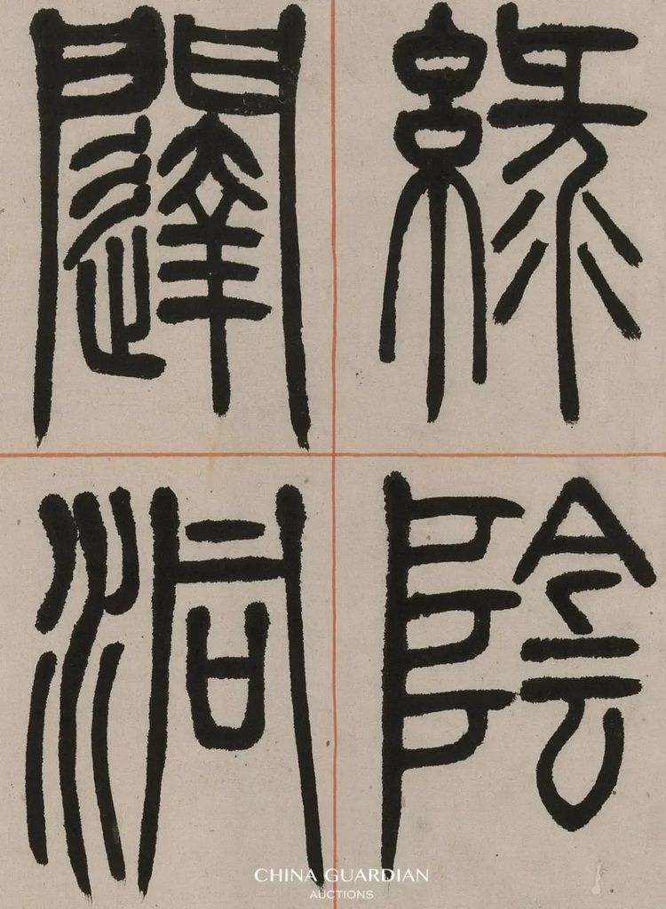 《邓石如篆书》,每页三行,每行四字,所书内容摘录韩山朱公《座右铭》,现藏无锡市博物馆。此帖笔力遒练,骨力如棉裹铁,体势沉着,运笔如蚕吐丝。以隶笔作篆,既有逆起驻收,内敛含蓄,也有逆入平出,轻松流畅。大胆地用长锋软毫,提按起伏,丰富了篆书的用笔。线条圆涩厚重,雄浑苍茫,臻于化境,开创了清人篆书的典型,可视为邓石如传世墨迹中的代表之作。