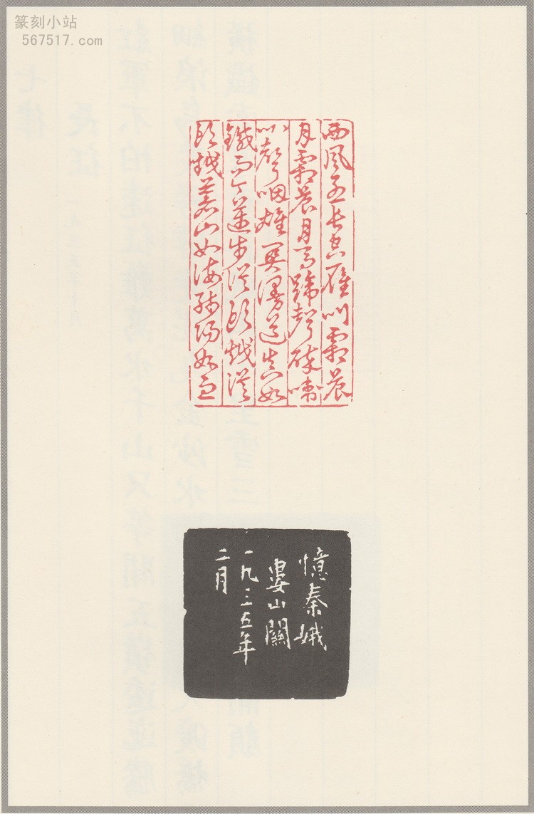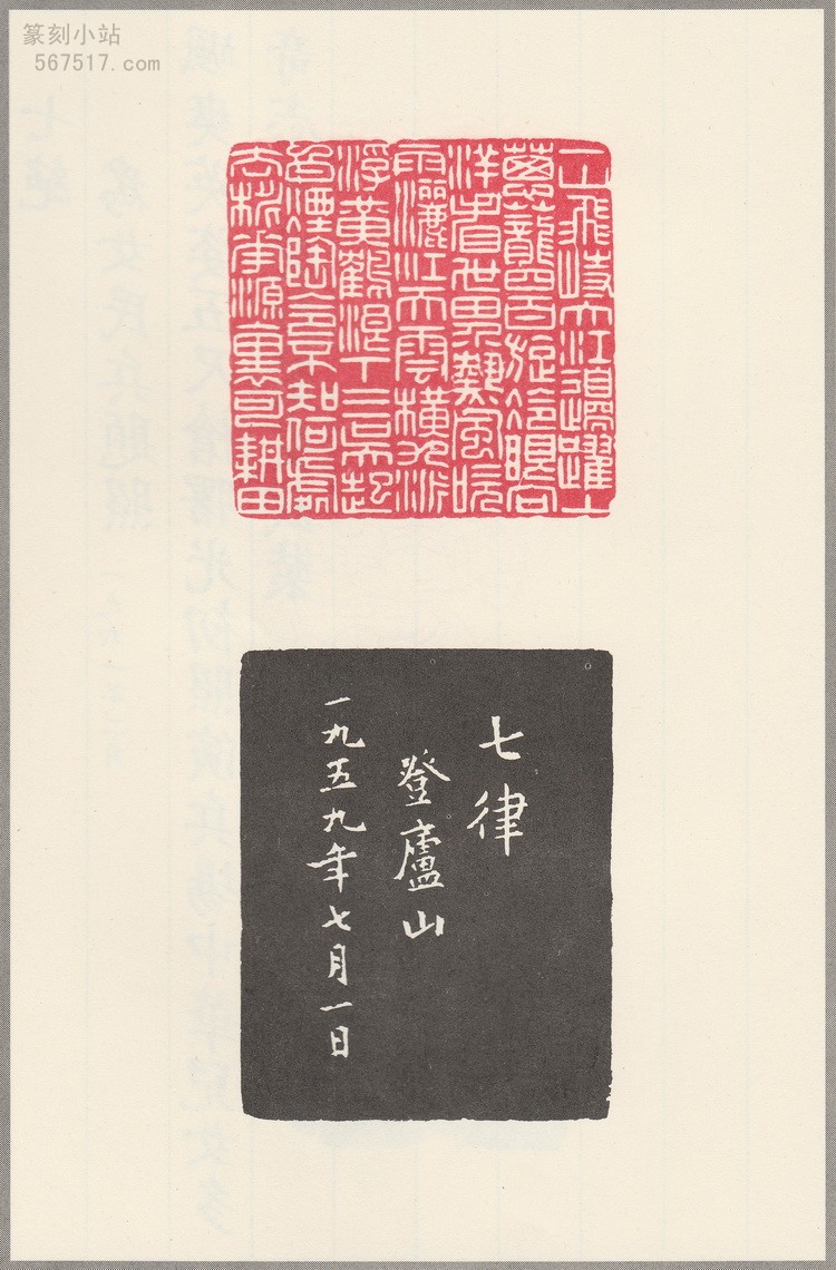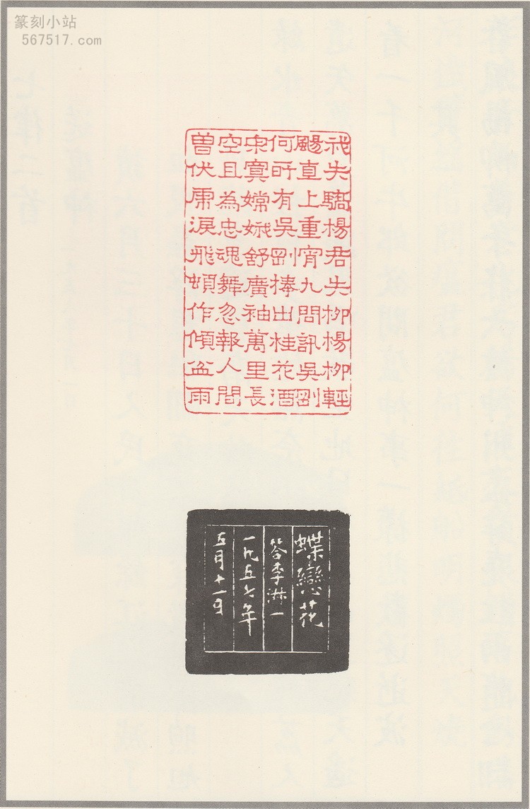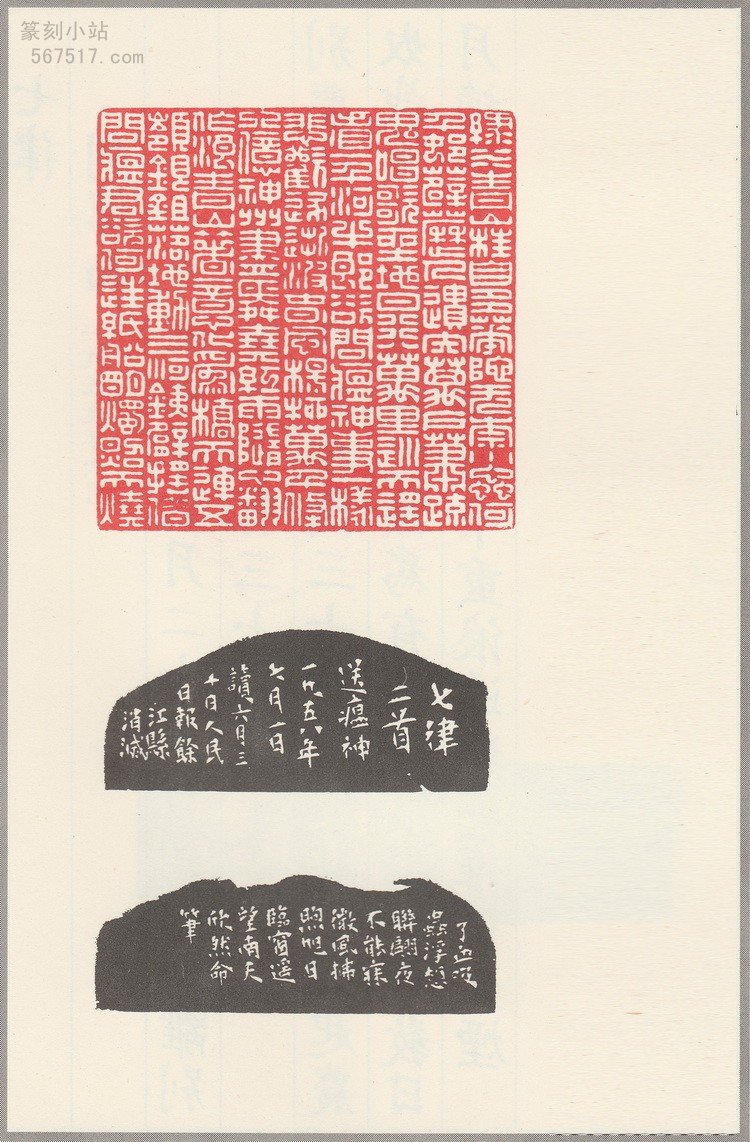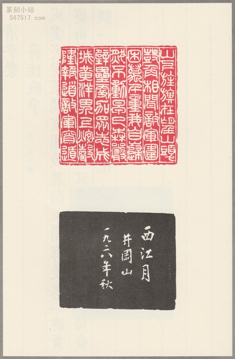 翻开这本印谱,首先映入眼帘的是那一方方精美的印章。每一首毛主席诗词都被精心镌刻成一印,其中《七律・送瘟神》二首合刻一印,《十六字令三首》则分刻三方,共计三十六印。这些印章在谋篇布局上独具匠心,文字的排列疏密得当,线条的粗细变化自然流畅,充分展现了韩登安在多字印创作上的高超技巧。