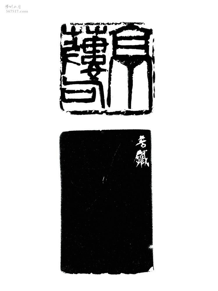 技法上,这方印章尽显吴昌硕的艺术精髓。其边框线采用双重交会结构,粗细与残损差异化处理,左厚右细、上虚下实,与印文笔画形成巧妙呼应。吴昌硕独创的“钝刀硬入”技法在此印中发挥到极致,厚重饱满的线条自带“屋漏痕”般的金石韵味,将“力、势、气”完美融合。章法上左、右、上三边逼边,下部留空,形成“密不透风”与“疏可走马”的强烈对比,“亭”字独行挺立,竖画贯气如虹,尽显雄浑气势。