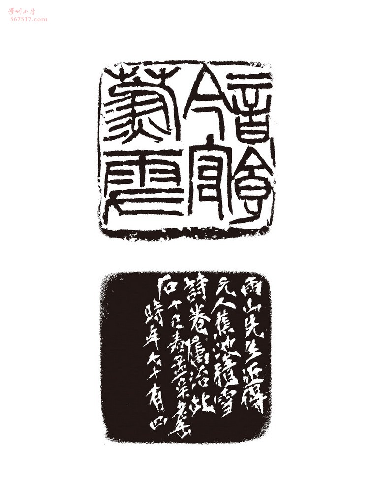 更有意思的是印章背后的故事。印的侧面刻着题跋,大意是“雨山先生最近得到了元代人的《蕉池积雪诗卷》,请我刻了这方印。丁巳年春天,吴昌硕,时年74岁”。这里的“雨山先生”是日本汉学家长尾甲,不过这方印的真正主人其实不是他,而是日本大收藏家山本悌二郎。