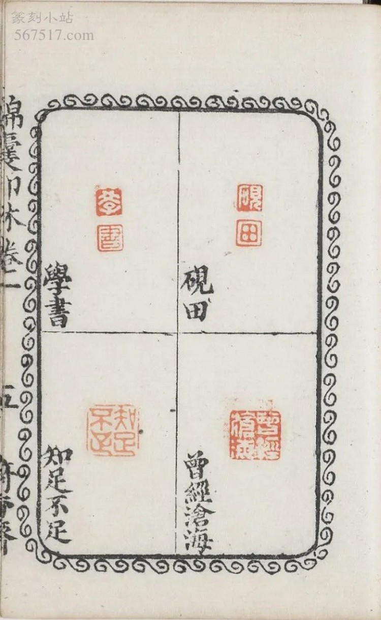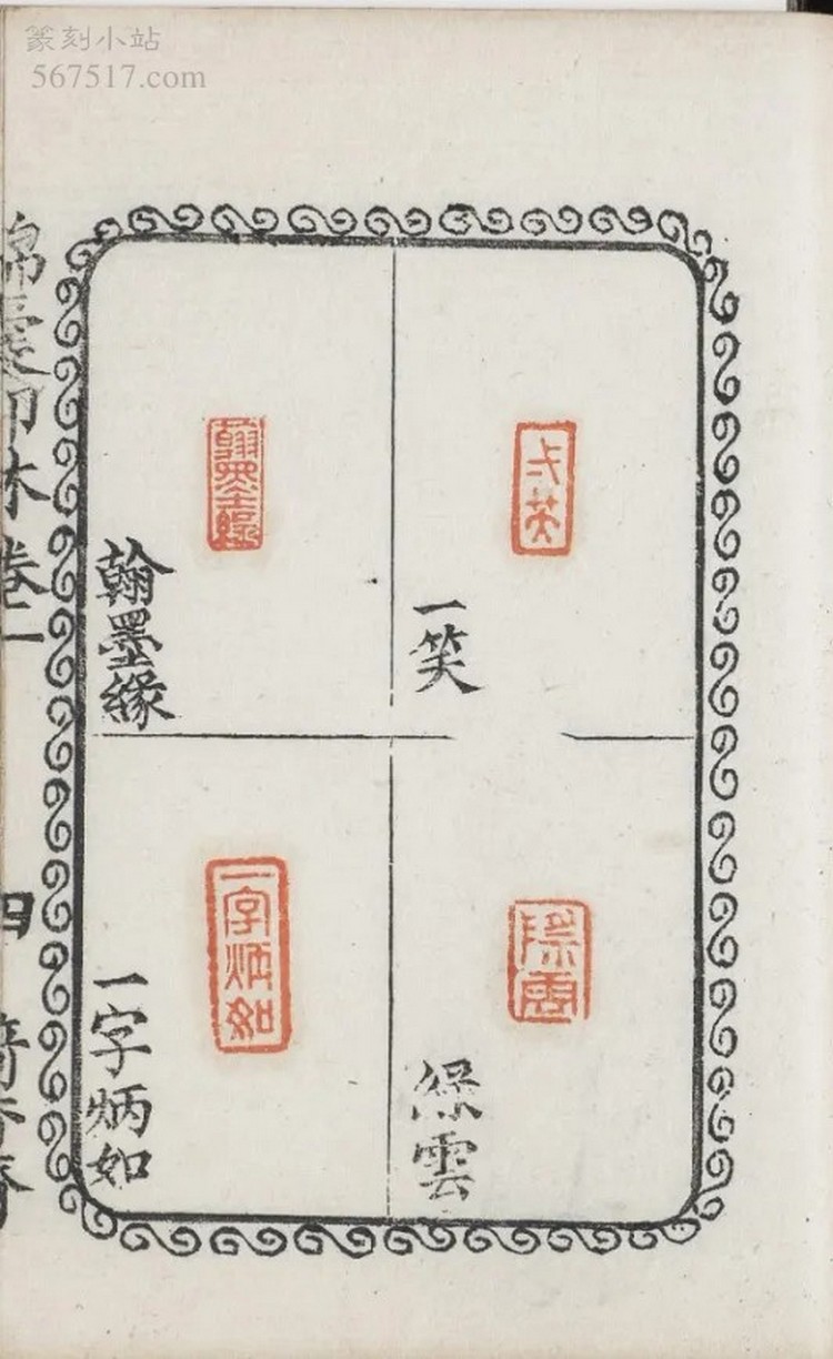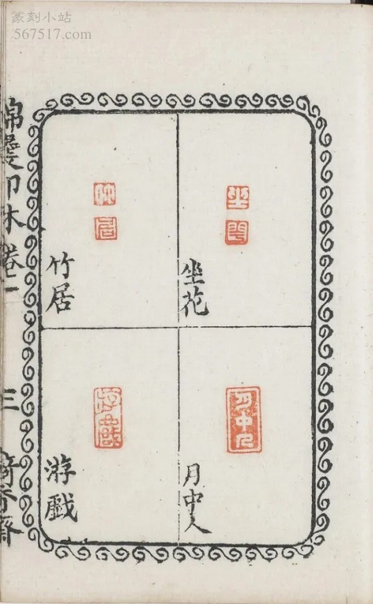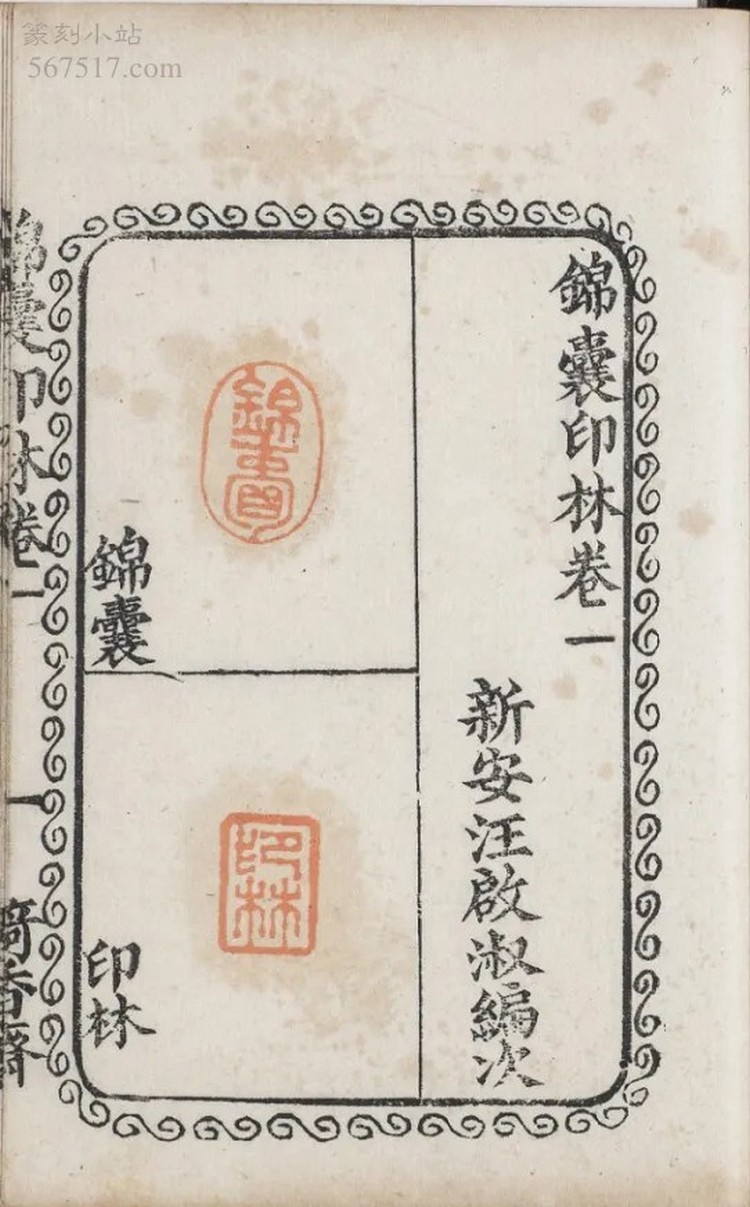 钤印精湛:《锦囊印林》的钤印工艺极为精湛,书法雍容,篆法整齐,配合位置一准于古。每页二至四印,下附释文,版心中镌谱名、卷次、页码,下镌“香雪亭”字样。
