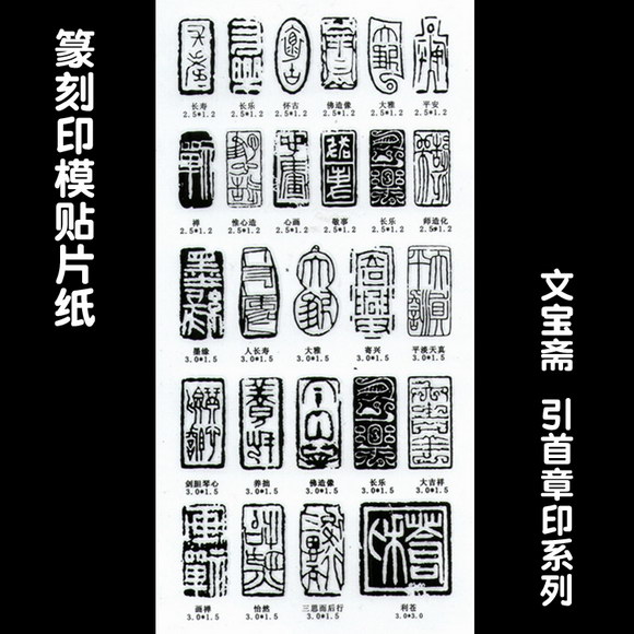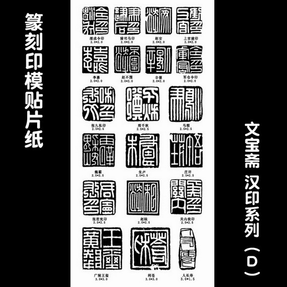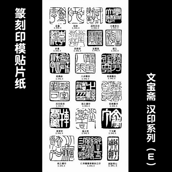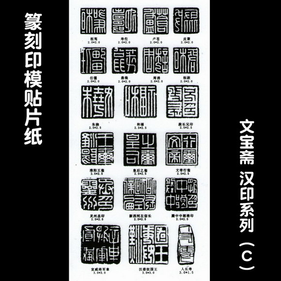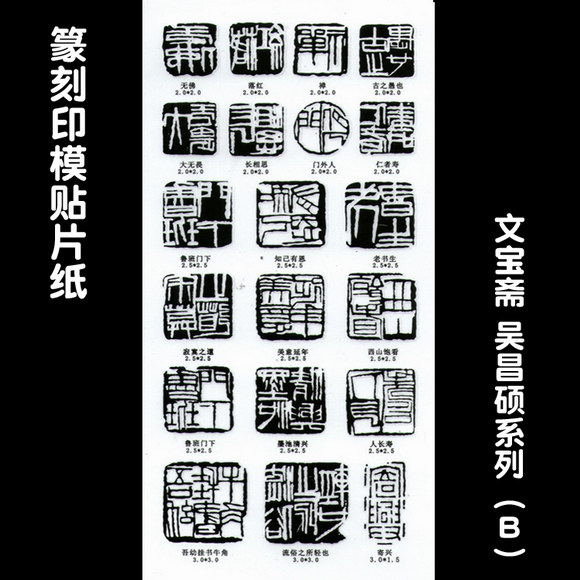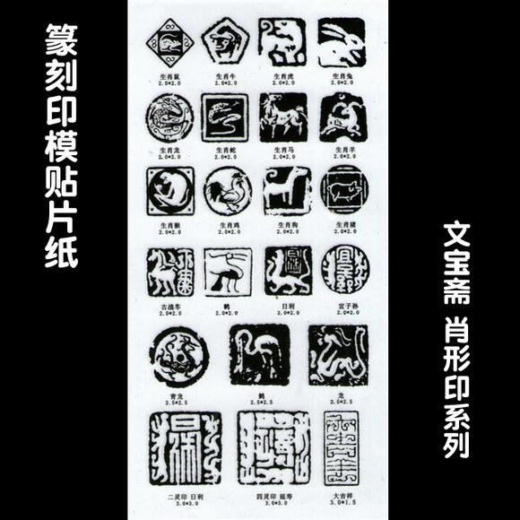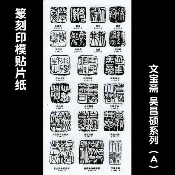 篆刻印模贴纸包括汉印系列5张、吴昌硕系列2张、肖形印系列1张、古玺系列1张、元朱文系列1张、压脚章系列1张、引首章系列1张。