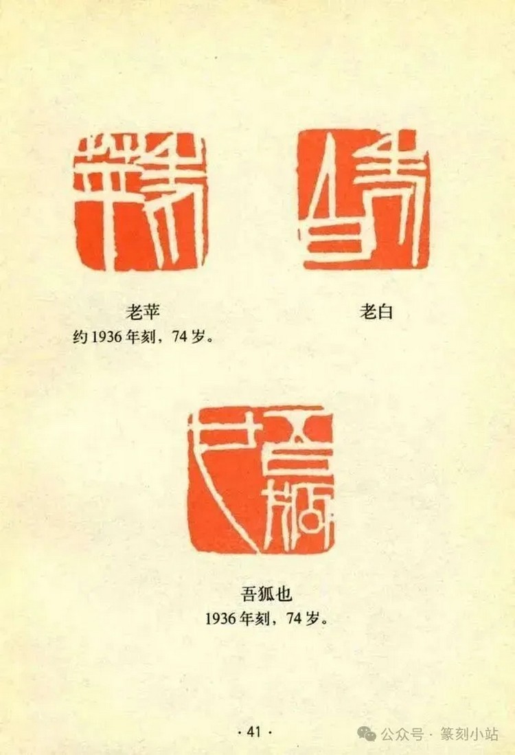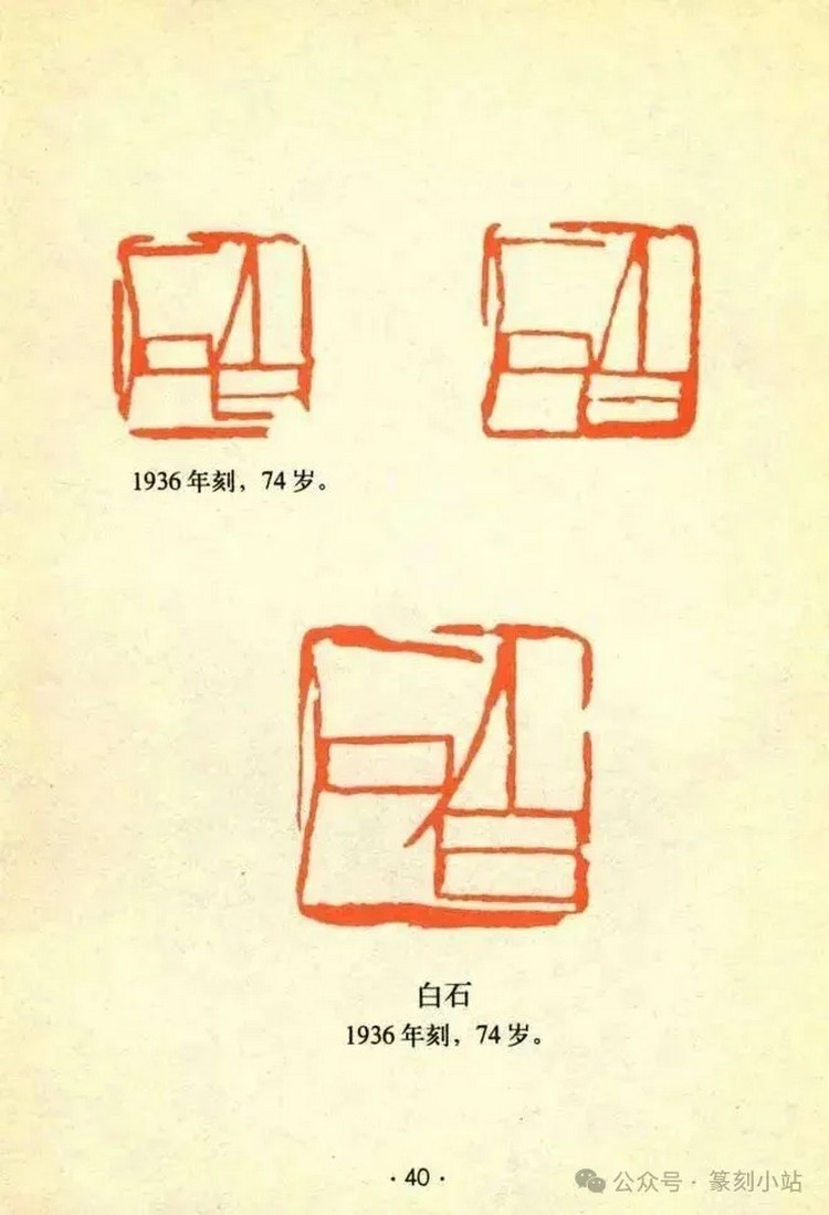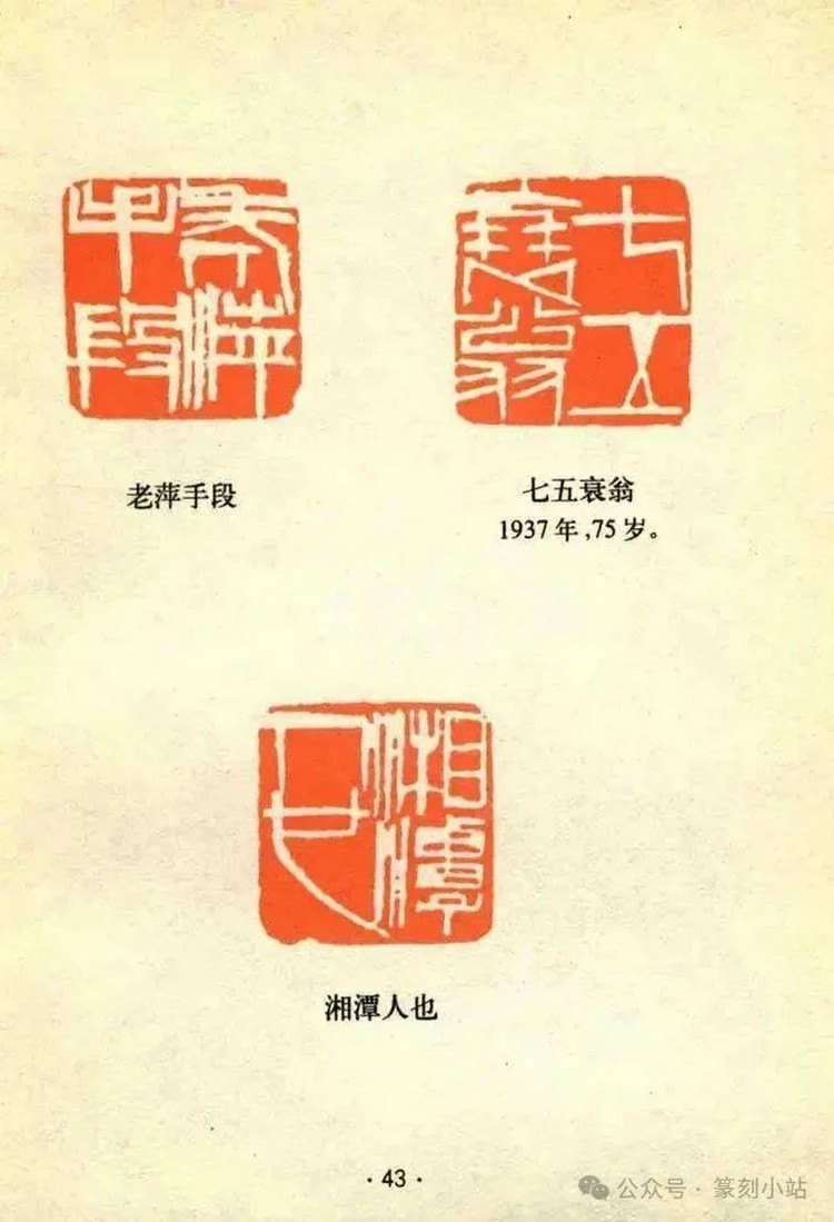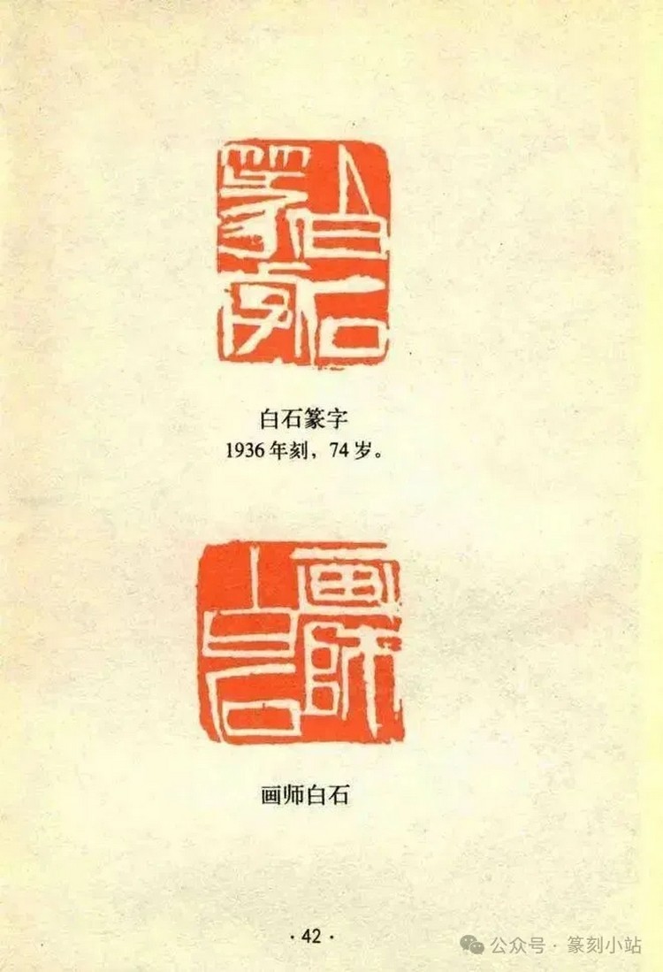 60岁以后,齐白石篆刻艺术迎来“衰年变法”,步入成熟鼎盛期,真正实现了“胆敢独造”的艺术追求。他将《三公山碑》的篆法、《天发神谶碑》的刀法与秦汉权量铭文的意趣熔于一炉,以单刀冲刻为核心,形成了直肆雄健、古朴自然的独特风格。这一阶段的印作,章法上兼具“空能走马,密不容针”的精妙,刀法爽利劲健,线条刚劲有力,既保留秦汉玺印的雄浑古朴,又融入自身的生活意趣与文人情怀,无论是自用印“白石翁”“老齐郎”,还是闲章“人长寿”“大匠之门”,皆独具匠心,意趣盎然。他刻印时“昆刀信手”“快剑斩蛟”的利落,偶尔不用画墨稿的创作方式,更让其印作多了几分天然意趣与艺术神秘感。