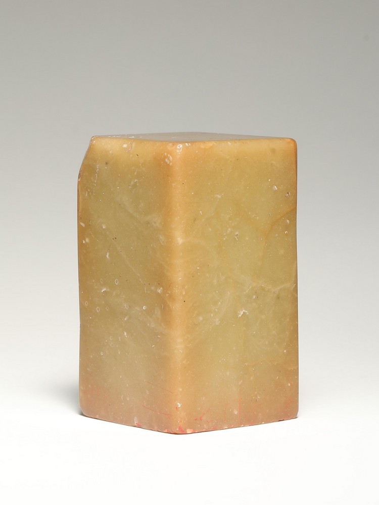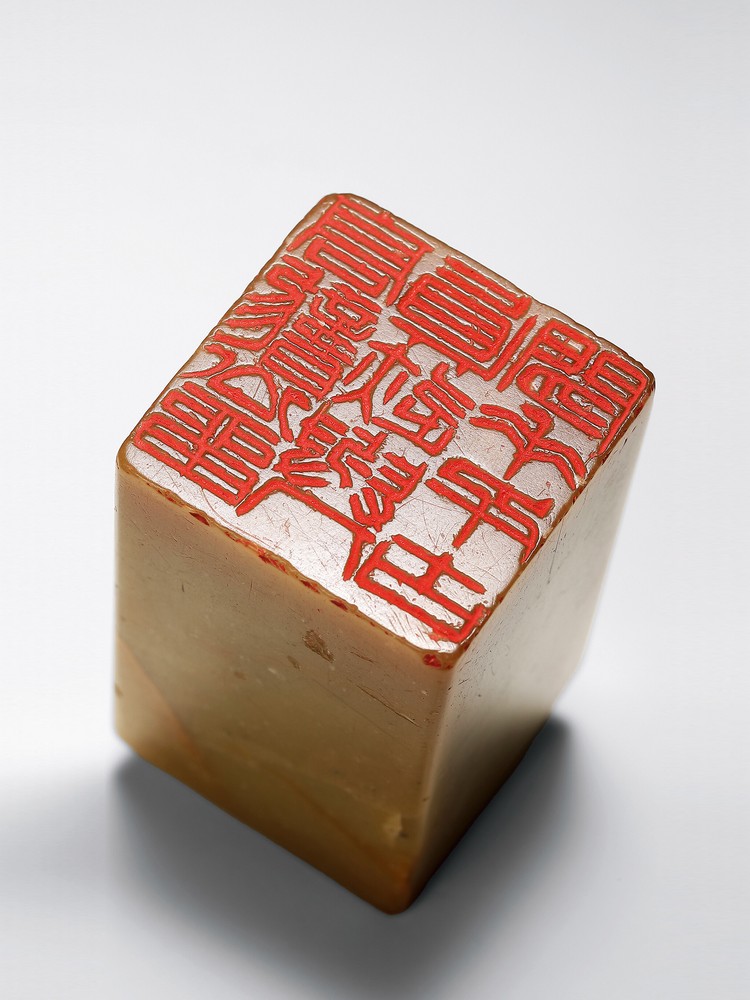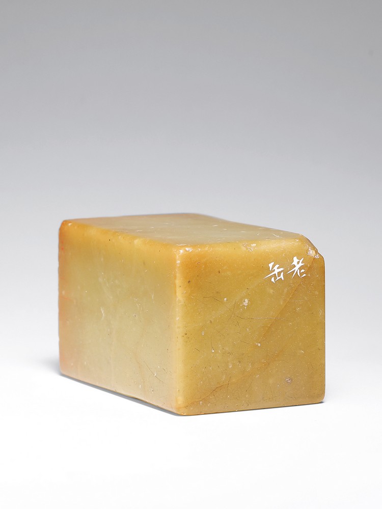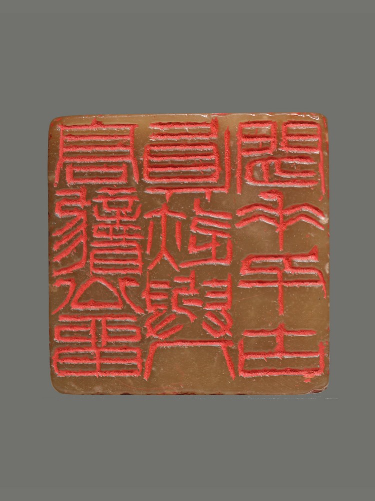 此印青田石质,尺寸3.6×3.6×6.3厘米,形制方正厚重。印文 “高聋公留真迹与人间垂千古” 共计十三字,以白文出之。印面布局紧凑而疏密有致,“高”“聋”“公”三字居右,“留真迹与人间”六字居中,“垂千古”三字居左,纵三行排列。