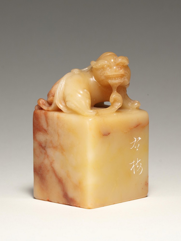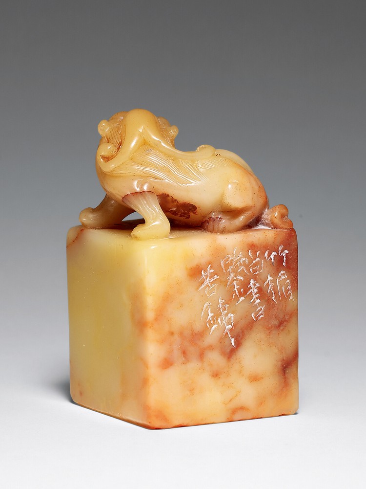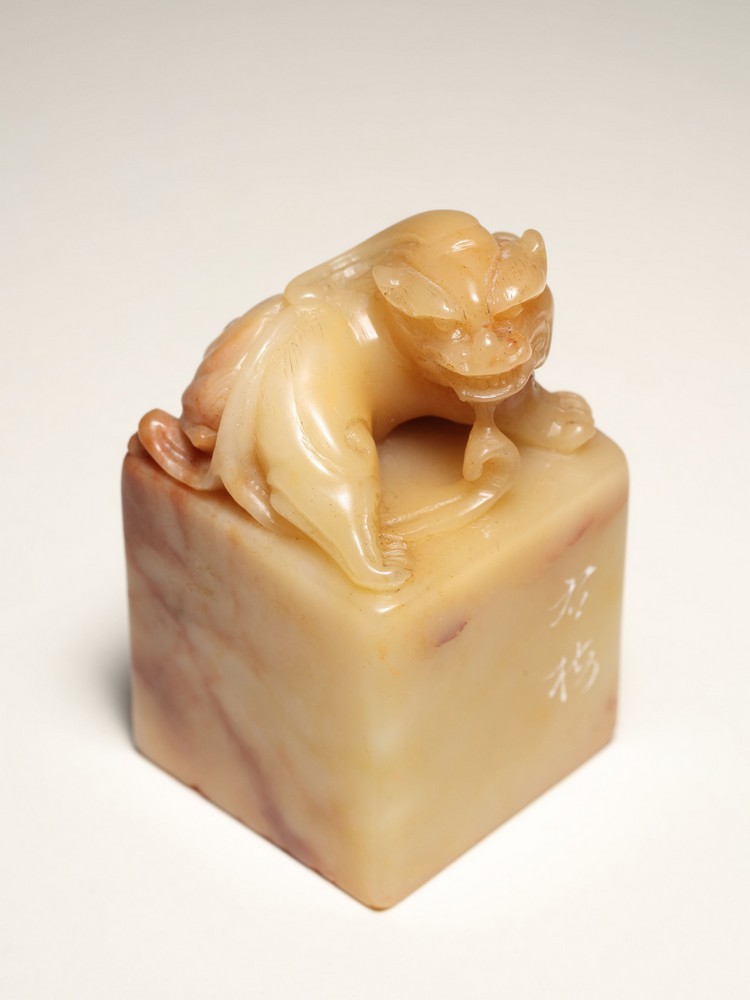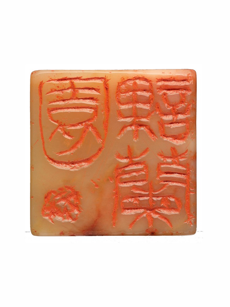 此印寿山芙蓉石质,尺寸3.1×3.1×5.4厘米,兽钮雕刻精工,石质温润凝腻。印文 “园丁课兰” 四字,以朱文出之。