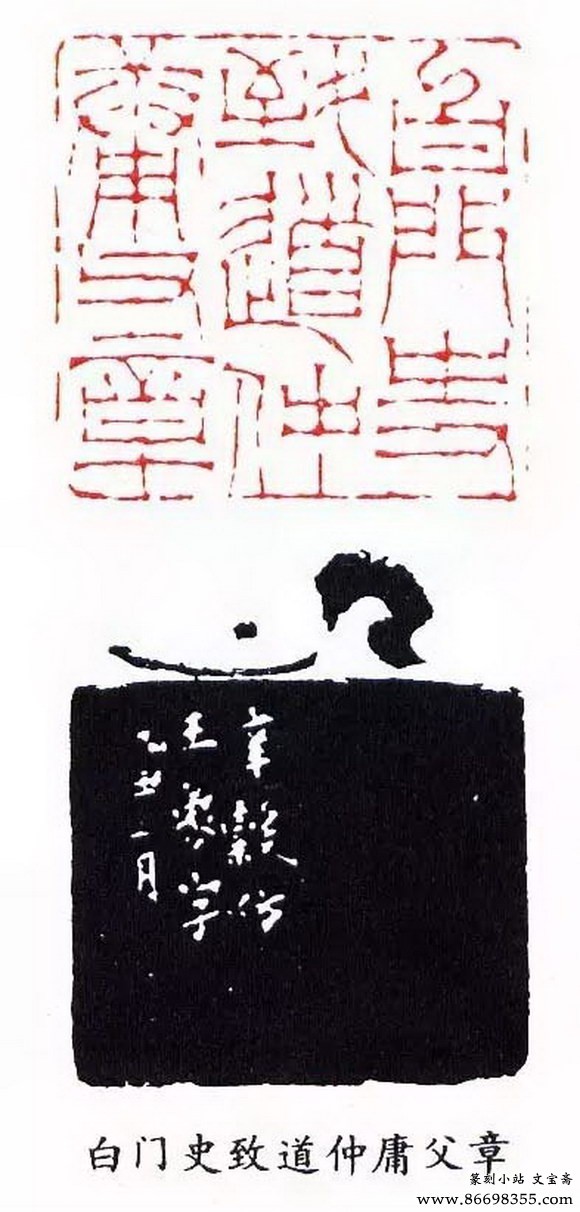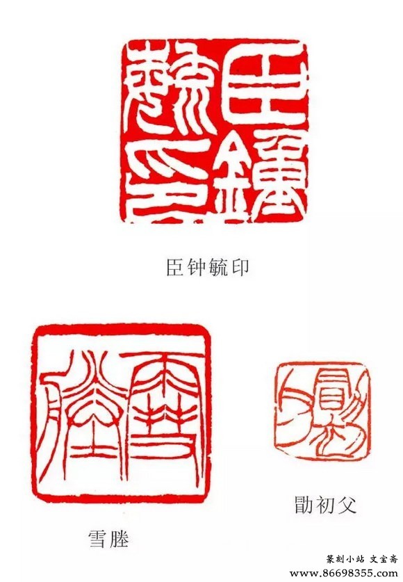 “臣钟毓印”和“雪塍”这两方印,疏密对比和对称。如“臣钟毓印”的在章法上都非常注意传统的“臣”和“印”二字,笔划较少,“钟”和“毓,笔划较多,分别作了对角呼应,使整体上有疏密对比。“雪塍”一印,基本上做到了对称,各种形态的笔划,都有互相呼应。