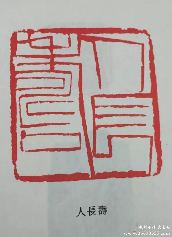 从“中国长沙湘潭人也”和”人长寿““鲁班门下”等作品中可以看出“长”、”鲁“字都是以隶楷书的写法。而齐白石将这些字与篆书结合在一起,足见其大胆过人之处。其最擅长的是在不整齐中求统一的“乱石铺階”的章法。而且他将绘画中的虚实、呼应、原理都融入篆刻章法之中,这也是齐白石的篆刻总给人以新鲜感的原因之一,章法常使人感到意外的地方,这是他经过半生刻苦实践的总结积累的经验。下面再做具体的分析: