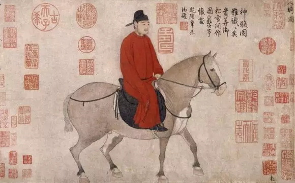 被乾隆等爷以印章刷屏的赵孟頫《人骑图》(局部)