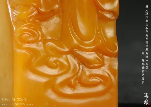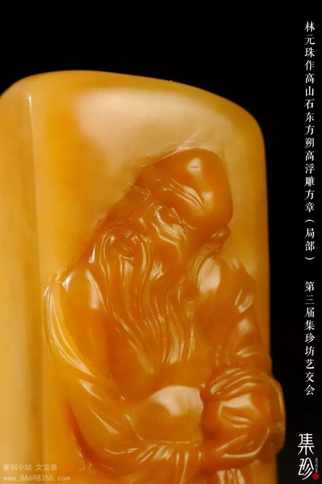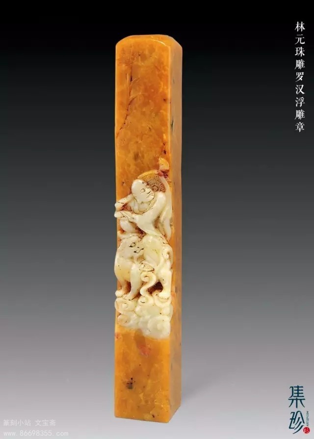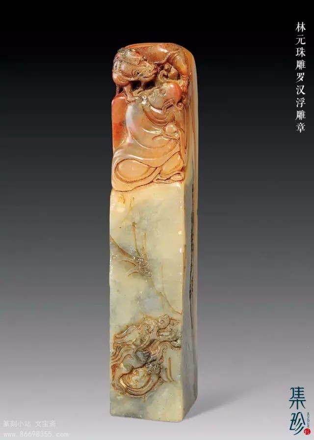 据说,时人评述,林元珠所作的兽钮,筋力遒健,特别着意于须、鬃、毛发的处理;行刀流利,精致活泼;螭虎穿环,飞鳌水兽,尤为精妙;人物雕刻,于单尊外,尚以半悬身法作群雕,皆古拙朴茂。时人争相收藏。