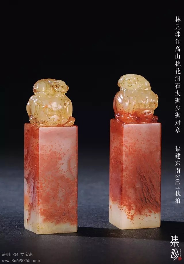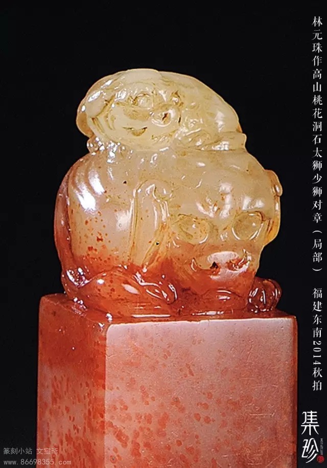 如今我们来看林元珠的作品,也的确符合这样的特征。2014年的东南秋拍中,他的一对高山桃花洞石太狮少狮对章,以概括性的线条精炼地表现出狮子的外貌特征,虽然只有寥寥数刀,却将狮子遒劲有力的肌肉展现得准确而生动,又极富传统趣味。