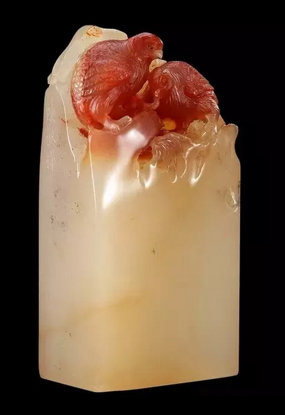 寿山石印章薄意钮雕始于清朝初年的周尚均。周尚均原是闽南的雕刻技师,可能是受到德化瓷雕的影响,到福州后,运用到寿山石印章上来。他先是在印台四周的印边刻浅浮雕锦褥纹和四边不断纹或其他图案,开创了薄意艺术的先河,以后有潘玉茂继承其遗法,到清朝末年福州西门林清卿专攻薄意艺术,成为特别有成就的薄意雕法大师,被称为“西门清”,誉满省内外。继林清卿之后,有王炎铨、王雷霆、江依霖、林文举等人,都是薄意雕刻大师,很有影响力,被称为“西门流派”。