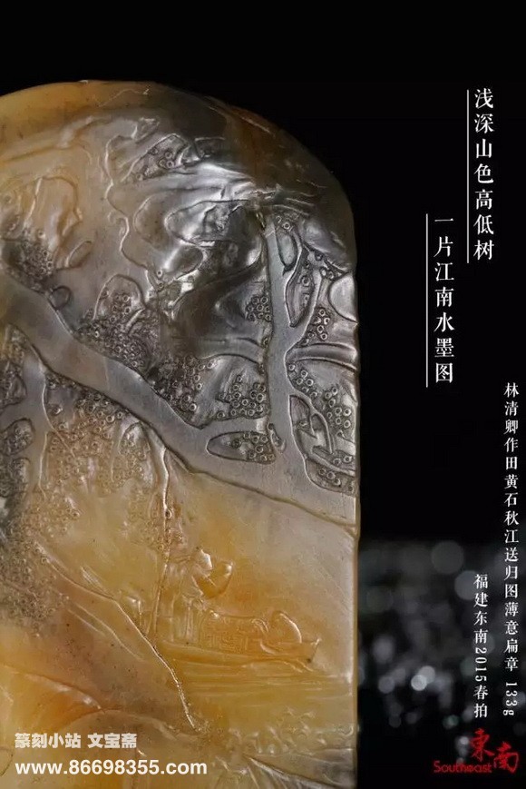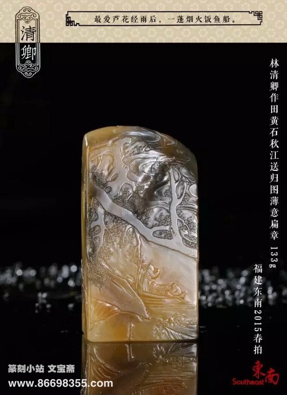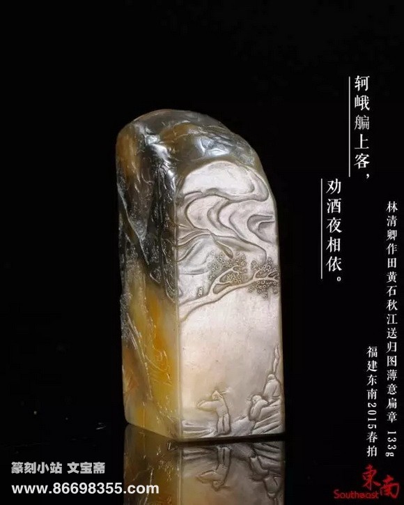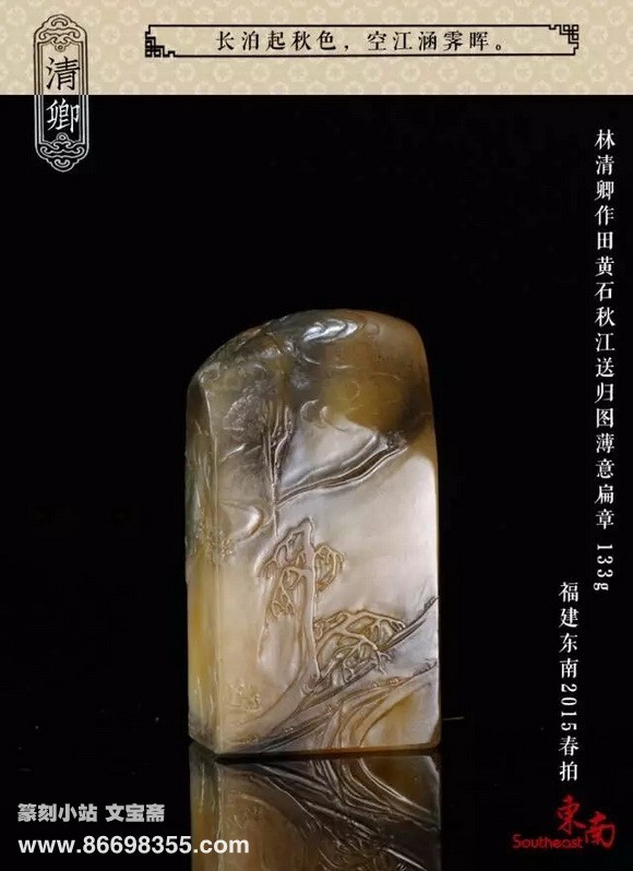 这件田黄石形制规整,裁切方正,外部整体显灰白色,内里则带有桂花黄意,其灰黑色泽弥漫晕开,柔和自然,如同中国传统水墨山水一般,别有一番韵味。作者借此纹理巧色,将其雕刻为《秋江送归图》薄意扁章,以灰黑巧色雕刻为江岸高树,枝叶蓊郁,树干横斜,仿佛以水墨勾勒,以水墨点染一般,令画面充满了江水的湿润气息。整件作品清新恬淡,又极富故事性,余味悠长,颇可细品。