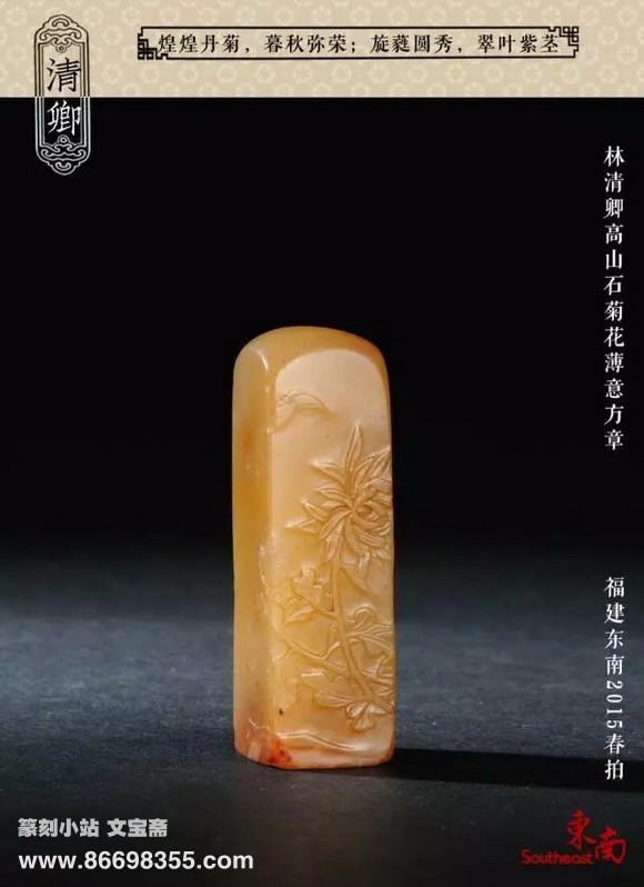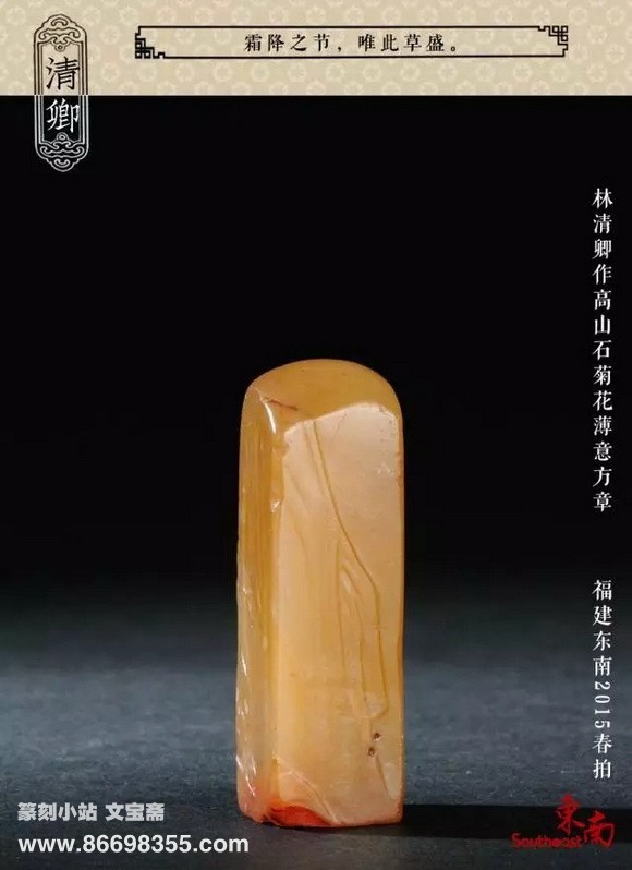 这枚方章以高山石雕琢而成,色泽橙黄,犹如“天将金阙真黄色,借与洞庭霜后橙”之摄人心魄,作者在其上雕刻出山石一脉、秋菊一丛,山石坚韧,秋菊柔美,形成了鲜明的对比.大朵菊花正在盛放,花瓣层次感极为丰富,枝叶相互交叠却繁而不乱,而周围尚有两三朵菊蕾,含苞待放,犹有呼应的美感。“黄菊拒霜殊未秋”,画面尤为清新雅致,幽韵冷香,将秋意描绘得无比醇厚。