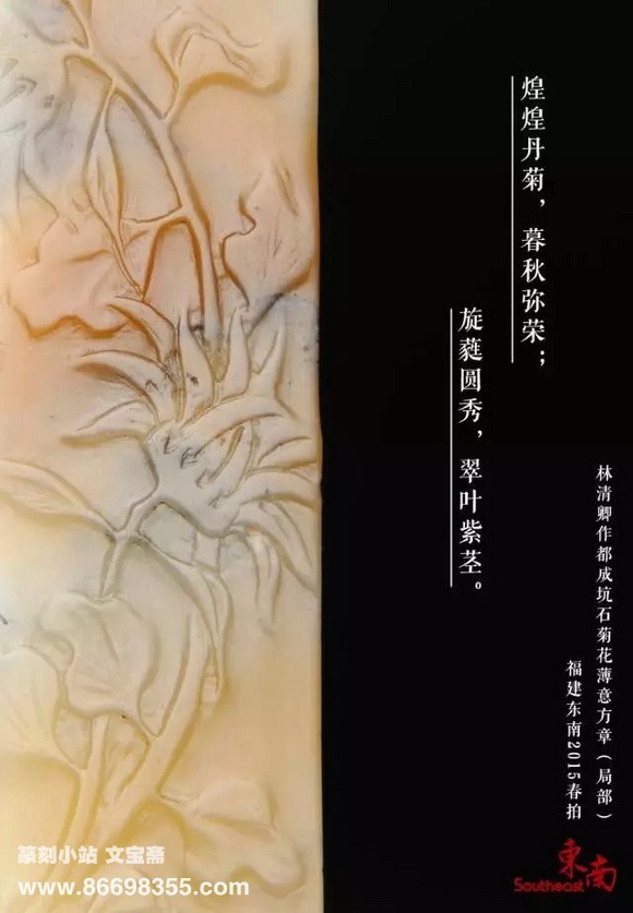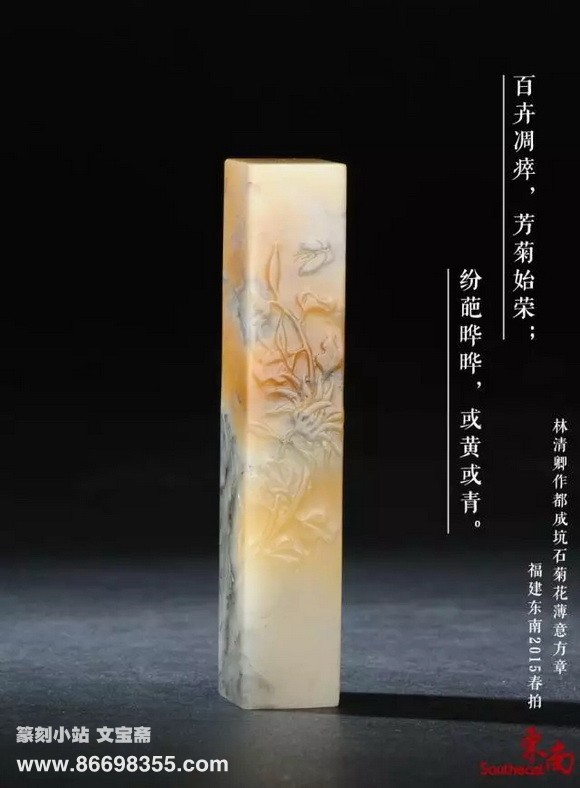 著名金石书画家陈子奋《寿山印石小志》评价都成坑石:“外有青黑色石皮,石工留其多寡,刻以薄意之花卉、山水、巧妙天成,田石几不能专美矣。”这枚方章运用了点点巧色雕刻墨菊,剔地圆熟,线条流畅古朴,充分展示出了笔墨的韵味与画意。“秋菊有佳色”,经霜不凋,独出幽芳。