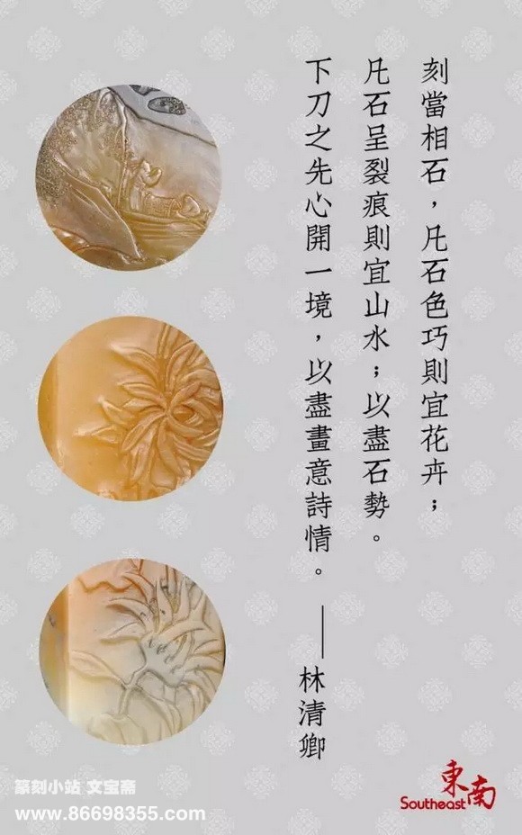 现代薄意艺术的“开山鼻祖”林清卿是这样讲述薄意创作的:“刻当相石,凡石色巧则宜花卉;凡石呈裂痕则宜山水;以尽石势。下刀之先心开一境,以尽画意诗情。”他又说:“薄意创作以花卉最难,妙在善配巧色。”