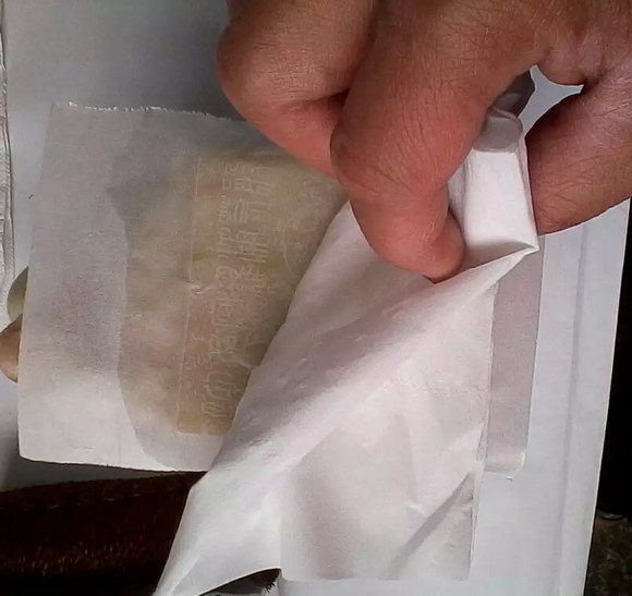 7.先将吸满墨的拓包在吸纸上吸去多余的墨;