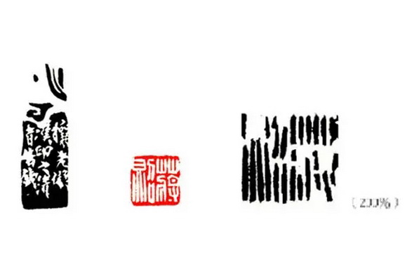 溯自秦印的田字格与日字格,可以让印面显得规矩方正,例如〈张大之印〉、〈永基〉二印,配合自身的篆法,藉由界格线的横、竖、长短等粗细轻重线条,可以让印面产生更丰富多变。也由于擅长使用界格,影响往后的章法佈局时,即使不用墨笔设计印稿,亦会在印石上轻轻画出界格,以示规矩中求变化。